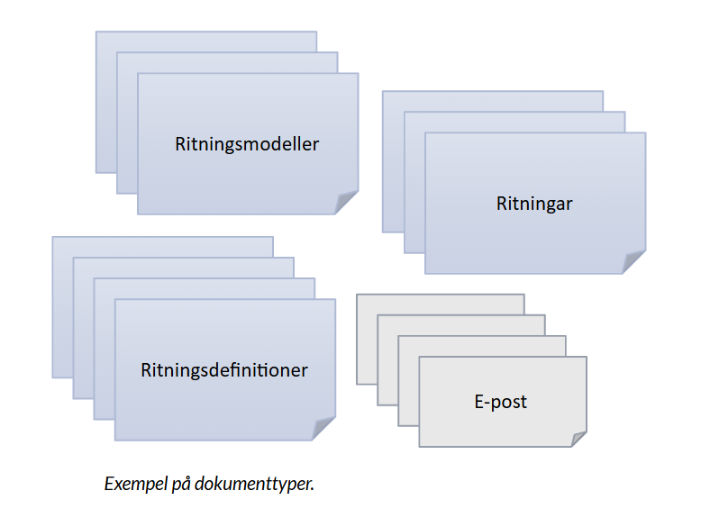 Dokumenttyper hjälper till att hålla ordning i projektet genom att gruppera liknande dokument, såsom e-post, ritningar, modeller och protokoll. Vilka dokumenttyper som behövs beror på projektets eller verksamhetens unika behov.